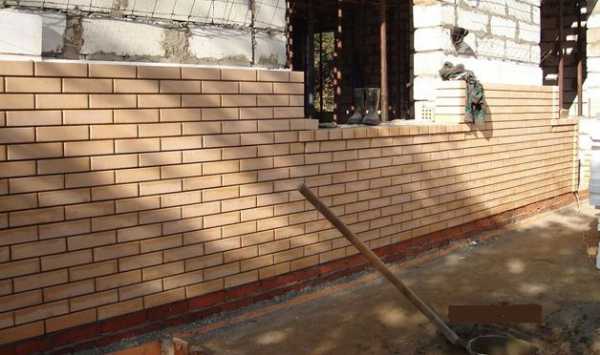 Обычно отделочные работы берут своё начало от угла постройки и идут по направлению справа налево. Конструкция должна быть закреплена с помощью металлических прутов. Это делается во избежание осыпания. С этой целью арматуру прокладывают в швы между кладками.