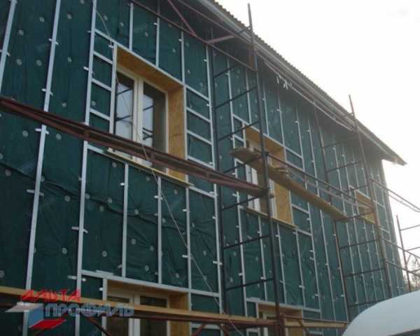 Можно крепить защитный материал и без каркаса, но это значительно ухудшит качество работ, поэтому лучше не лениться и сделать обрешетку. Для нее отлично подойдут строительные профили, но допускается применение деревянного бруса (профиль примерно 50х50). Только есть несколько оговорок насчет такой обрешетки. Желательно, чтобы длина бруса была больше высоты постройки. И если все-таки решили отдать предпочтение натуральной древесине, убедитесь, что она сухая, в противном случае каркас со временем поведет, заметнее всего это будет на фасаде, где много сочленений и переходов.