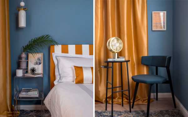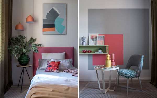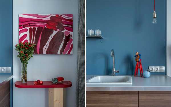 Цветовая гамма интерьера предполагается следующая: голубой + золотисто-оранжевый для взрослой спальни, в детской серо-зеленый + розовый, синий + красный в кухне. Приятные детали в виде мелочей на столиках и тумбах придают уют.