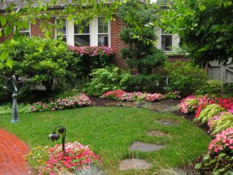 Если участок спланирован так, что всю площадь от забора до дома занимает газон, место для палисадника отводят рядом с крыльцом. Красивое мощение дорожки, крыльцо и палисадник создадут единую композицию. Стилевое решение всей композиции обязательно связывают с архитектурой дома.