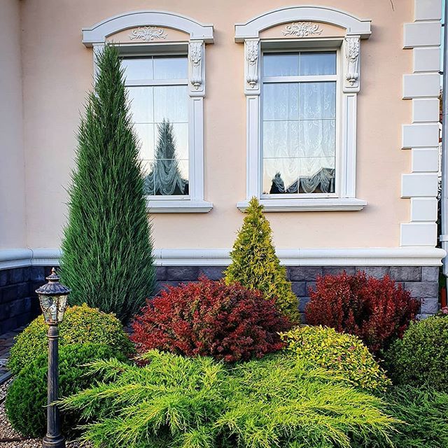 Что касается пород, выбирайте кустарники и деревья, которые легко стричь: карликовую ель, самшит, тую. А вот использовать высокие растения не рекомендуется – спустя несколько лет их кроны начнут заглядывать вам в окна и закроют весь декор.