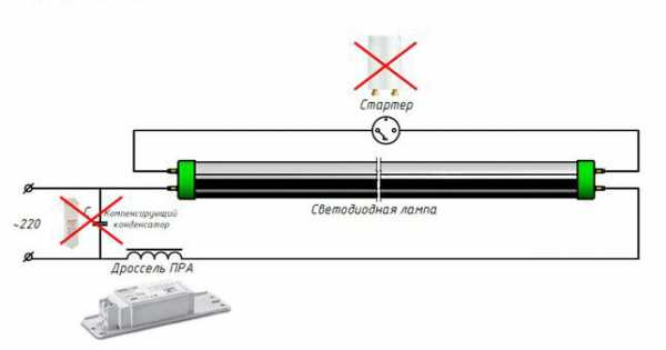 Производитель светодиодных ламп уже давно упростил нашу жизнь, выпустив трубчатые светодиодные лампы Т8, подходящие для цоколя G13. Остается лишь слегка переделать старый светильник. Для этого необходимо демонтировать из схемы подключения все ненужные компоненты.