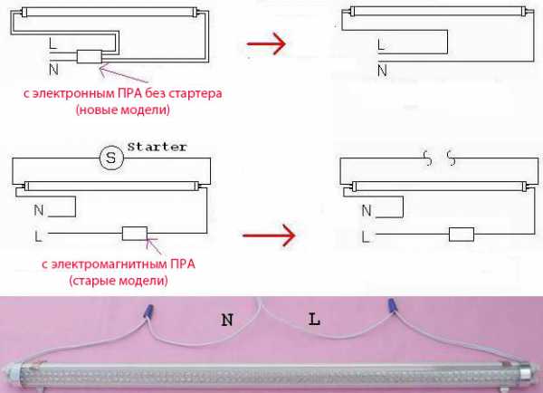 Для того чтобы модернизировать люминесцентный светильник, требуется лишь исключить из схемы стартер и дроссель и изменить подачу напряжения на лампы. Если электричество на ЛДС поступает по принципу «контактный штырь – фаза, контактный штырь – ноль» с каждой стороны, то светодиодные трубки подключаются «фаза на одну сторону лампы, ноль на другую». При этом не имеет значения, на какой из штырьков цоколя будет подходить провод, т. к. каждая сторона закорочена внутри осветительного прибора.