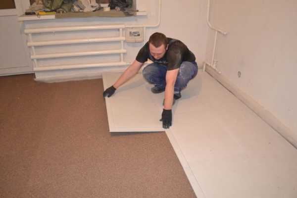 Если листы не квадратные, то ориентируйте их вдоль половых досок. Не допускайте, чтобы швы между листами сходились крестиком. Они не должны попадать и на швы между досками. То есть края двух соседних листов крепятся к одной и той же половой доске.