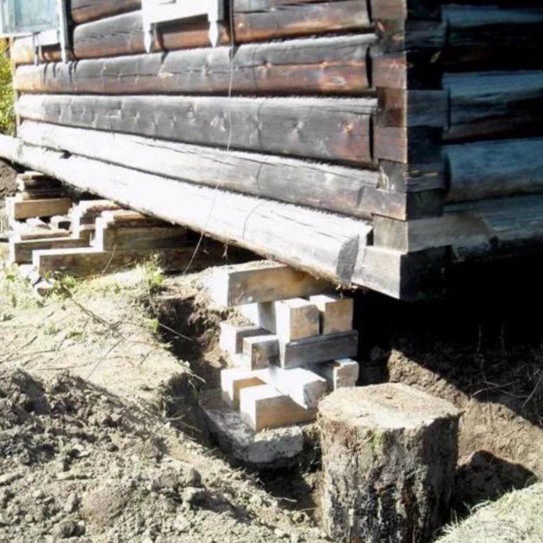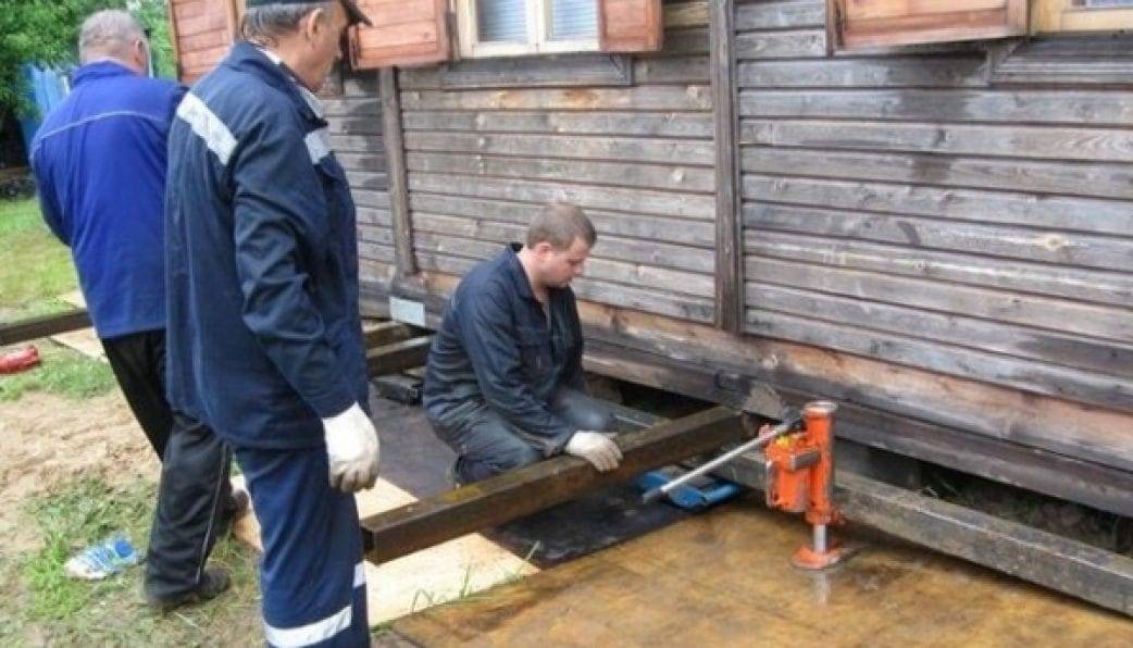 Наиболее распространенный способ, позволяющий произвести замену закладных бревен и при необходимости отремонтировать или заменить фундамент.