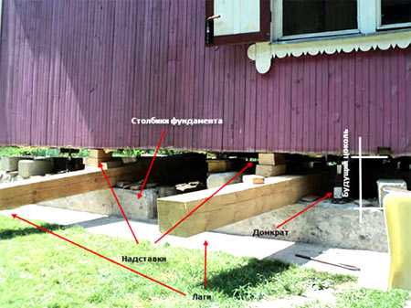 Чтобы избежать чрезмерной нагрузки, запрещается поднимать старый дом больше чем на 2 см. Рекомендуется каждые 5 мм подъема страховать установкой подпорок, которые должны размещаться на надежной, жесткой поверхности. Запрещается располагать их на непрочные конструкции старого основания.