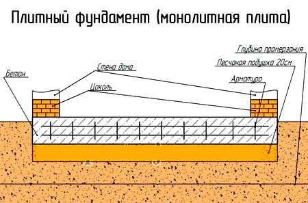 - Монолитная плита – применяется, если почва-грунт в местности болотистый и склонный к передвижению. Создается опалубка по всему периметру и заливается монолит. Этот тип основания очень надежный, но применяется редко, так как требует большого вложения средств.
