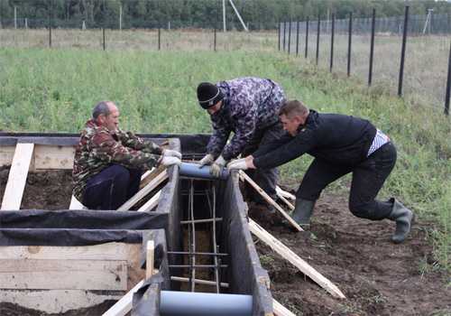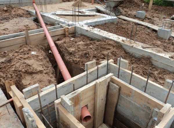 Также неотъемлемой частью любого строения является канализация и водопровод. Они обычно предусматриваются под самим фундаментом, поскольку заложение проводится непосредственно ниже уровня промерзания земли. Поэтому ими желательно заниматься еще до армирования, сразу после разметки, это значительно сэкономит затраты времени.