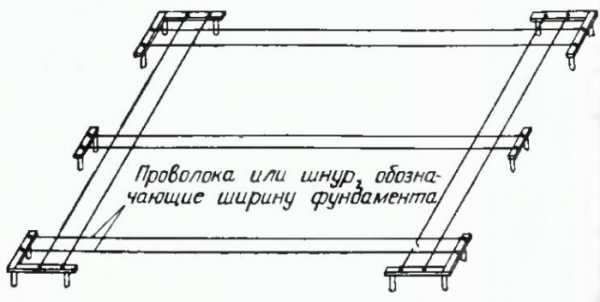 Перед тем, как правильно залить ленточный фундамент, необходимо подготовить земельный участок и выполнить разбивку будущего сооружения на местности. Для этого территория строительства очищается от мусора и ненужных зелёных насаждений. Далее выполняется разбивка осей будущего сооружения и их привязка от границ участка. После определения места расположения одного из углов дома под прямым углом к нему натягивается шнур. От него размечаются следующие углы здания и забиваются колышки. По колышкам натягивается шнур. От него отмеряют ширину фундамента и натягивают второй шнур.