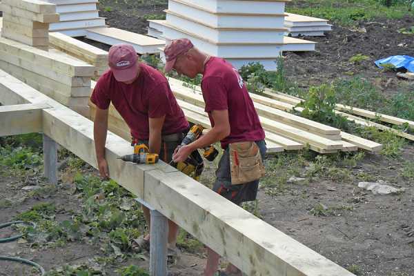 Поверх обвязки устанавливают лаги. Для этого используются брус 100х150(200) или сшитые доски 50х150(200). Это несложная часть сборки каркасного дома своими руками, но предполагает соблюдение некоторых моментов. Это: