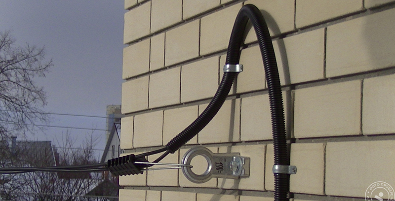 Соединение с линией электропередач осуществляется при помощи кабеля СИП и специальной арматуры. Для крепежа необходимо, чтобы на доме и опоре были крюки, за которые можно зацепить эту арматуру.