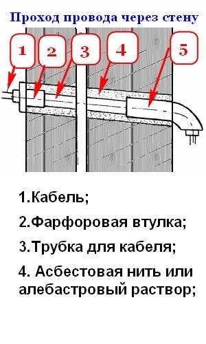 Поэтому, переход кабеля через стену в обязательном порядке должен проходить через толстостенную металлическую трубу, которая должна изгибаться вниз для предотвращения попадания вовнутрь атмосферных осадков.