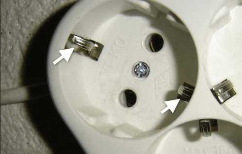 Сначала дотроньтесь одним концом провода к фазной клемме, а вторым – к нулевой. Контрольная лампа должна загореться. После этого тот конец провода, которым Вы прикасались к нулю, переместите на усик заземления (показан на фото ниже).