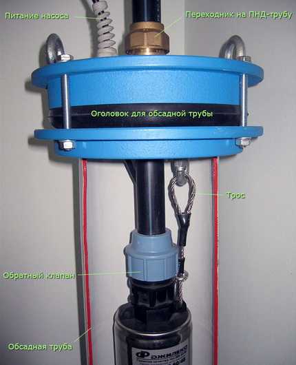 Провод должен лежать свободно, без натяжения. После того, как насос коснется дна, поднимаем его на высоту от одного до трех метров и закрепляем. Теперь устанавливаем на место верхнюю часть оголовка.