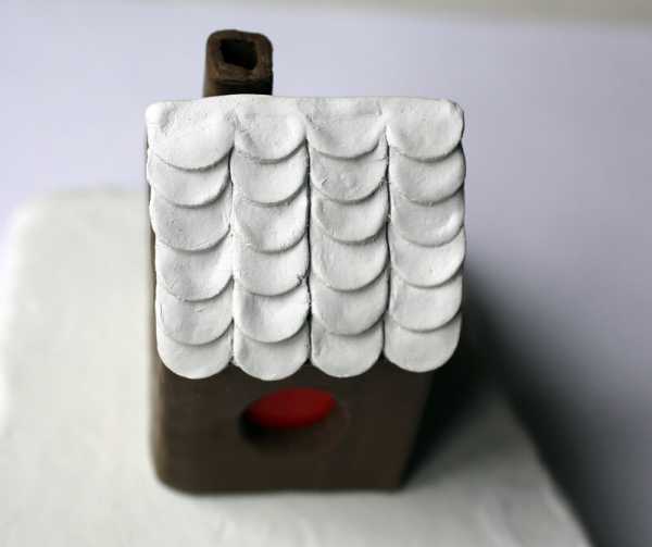 Примеряем подсушенную крышу к домику, смазываем ПВА и окончательно приклеиваем крышу. Сушим. Примерно через сутки можно приступить к следующему этапу. Сухая глина становится светлой и звонкой.