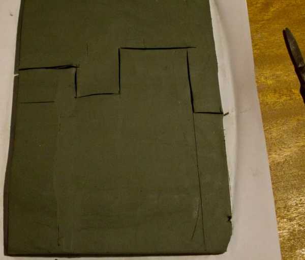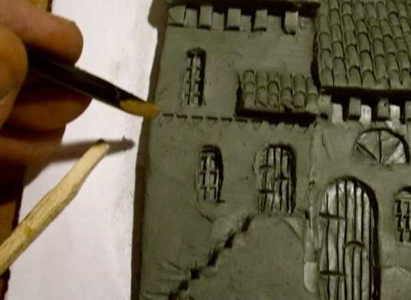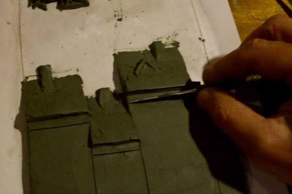 Глина раскатывается слоем 3-4 мм и ножом или скальпелем вырезаются детали. В стенах прорезаются окна, не старайтесь особенно четко соблюсти геометрию, небольшие искажения только интересней будет смотреться в готовой конструкции. Для того, что бы лезвие ножа не цепляло на себя материал из которого вы изготавливаете поделку – смачивайте лезвие ножа водой.