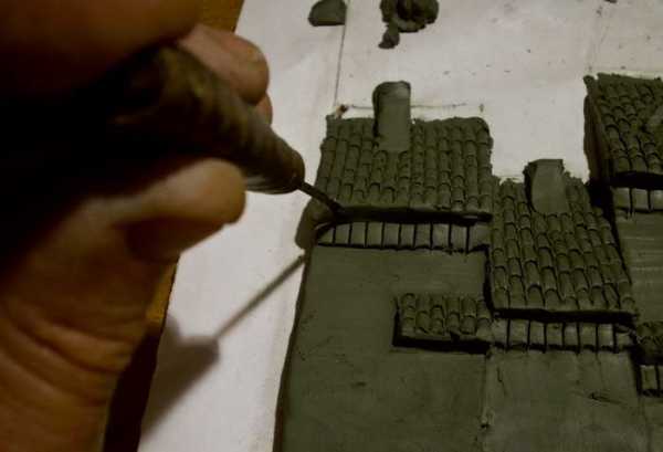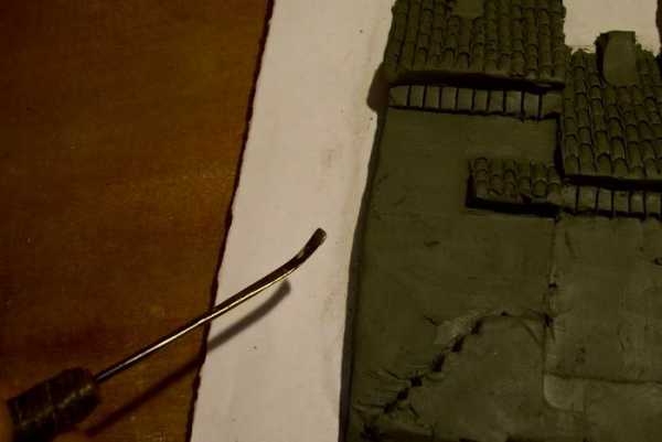 Но мы не станем останавливаться на достигнутом, а дополнительно хорошенько размоем черепицу мокрой кистью и разгладим шпателем, чтобы придать черепичкам гладкость, а крыше – монолитность. По высыхании между рядами могут образоваться трещины, их придётся замазать полужидкой глиной.