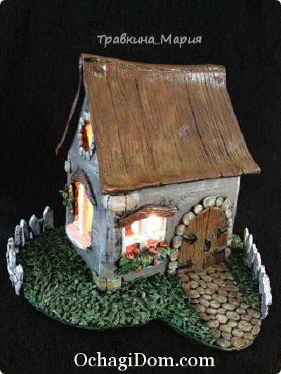 Сувенирный домик можно использовать и в качестве декоративного светильника со свечкой внутри. Для такого домика лучше всего брать самотвердеющую глину. Тогда, после того, как домик полностью затвердеет, он будет полностью пожаробезопасным, ведь все соединения выполнены из той же самой не горючей глины. Впрочем и у запекающейся массы есть возможность поучаствовать в изготовлении декоративного светильника своими руками – достаточно сделать под светильник отдельную часть конструкции, например – башню примыкающую к домику.