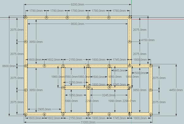 Используя размеры, указанные на рисунке, примерно отметьте центры расположения опор. Выберите один угол в качестве исходной базы, а затем извлеките все измерения из этого места. В противном случае ваше измерение будет содержать ошибки.