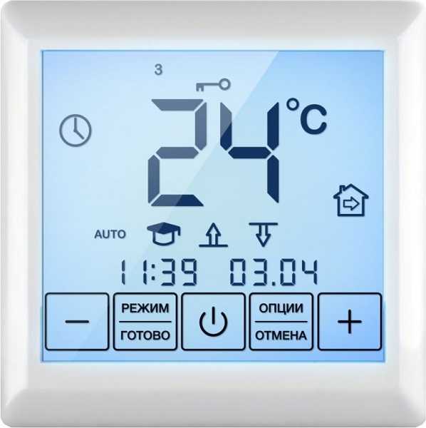 Внешний вид цифрового терморегулятора- Цифровые программируемые терморегуляторы – позволяют установить определенную температуру на разное время суток (день – ночь) или по дням недели. При отсутствии людей температура снижается, перед приходом повышается, это делает режим работы более экономичным.
