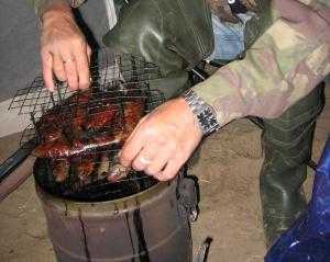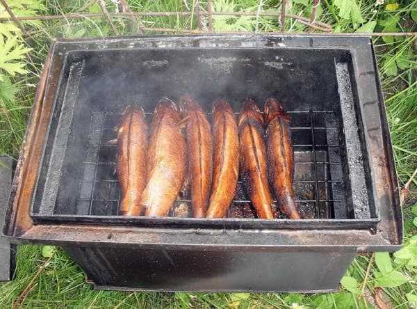 - При надобности можно добавлять свежую траву. Через три часа мешок снимается, и рыба проветривается. Крупная рыба при надобности коптится еще раз на следующий день.