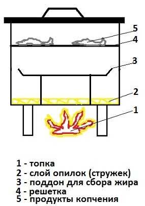 Общее понятие коптильни заключается в закрытой емкости или отсеке, куда поступает дым от очага.