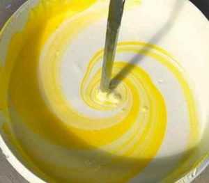 Затем в воду, чтобы соблюсти правильную рецептуру водоэмульсионной краски, высыпается мел и доливается мыльный раствор. Когда данные ингредиенты водоэмульсионной краски разбавлены в воде, остаётся лишь тщательно перемешать всю смесь посредством лопатки или миксера.
