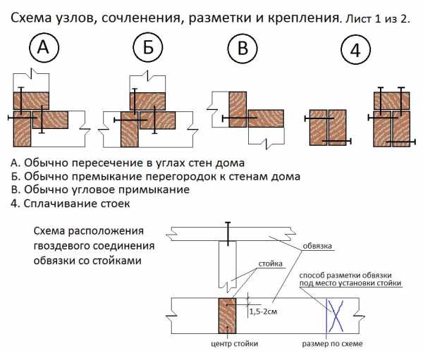 Крепление коротких брусьев всегда выполняется шпунтом на половину доски. Это обеспечивается прочность соединения на разрыв. Вертикальный каркас обязательно необходимо развязать горизонтальными брусьями.