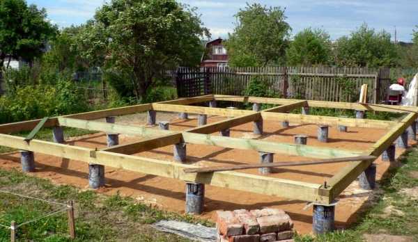 По периметру будущего дома, поверх фундамента, прокладывают деревянный брус, пропитанный антисептиком, под него укладывают рубероид. Конструкцию укрепляют анкерными болтами. Обязательно проверяют углы при помощи уровня, чтобы не было перекосов. Черновой пол можно сделать из необрезной доски. Сначала кладут лаги, между ними утеплитель из пенополистирола или базальтовой ваты, а сверху укладывают доски. Перекрытие также можно залить из бетона.