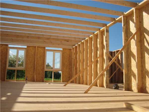 После того, как основные стойки установлены, надо проверить их соответствие проектному положению. Дальше монтируются подпорные брусья, которые держат обвязочную балку по верху. В местах, где предусматриваются межкомнатные перегородки, также следует установить опоры и обшить их либо листами ОСБ, либо обрешеткой.