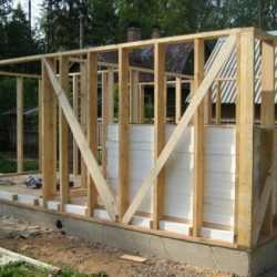 После установки всех элементов каркаса, временные укосины постепенно снимают и заменяют постоянными из прочного бруса. Эти укосы должны находиться в плоскости стены. Они придают каркасу дополнительной устойчивости.
