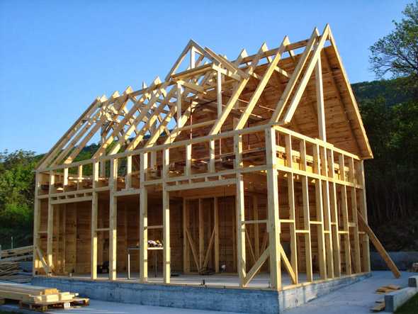 Для деревянного каркаса нужна древесина высокого качества с максимальной влажностью 12%. Минимальное сечение брусьев 15 х 15 см, а длина подбирается по высоте дома. Углы соединяют методом шип-паз так, чтобы зазоры полностью отсутствовали. К брусьям крепят балки с шагом 30, 40, 60 см в зависимости от того, какой материал выбран для обшивки. Под будущими окнами закладывают дополнительные балки. В качестве наружной обшивки дома используют вагонку, доски, ОСБ.