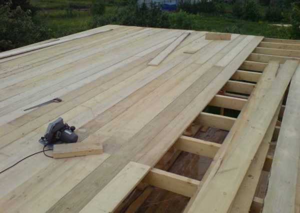 - Устраивают обрешетку. Вид ее зависит от выбора кровельного материала. Если это металлопрофиль, то используют брус 5 х 5 см. Крепят его через каждые 0,5 м. Под гибкую черепицу устраивают сплошную обрешетку из ОСП.