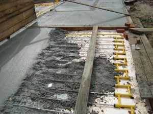 Далее необходимо положить гидроизоляционный слой, чтобы на основании не образовывался конденсат. Все стыки этого слоя заклеиваются обычным строительным скотчем. Затем настилается теплоизоляция, в качестве которой обычно применяют пенобетон. На теплоизоляционный слой укладывается арматурная сетка. Она сделает стяжку достаточно жесткой.