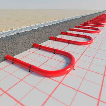 С помощью пластиковых хомутиков трубы крепят к арматурной сетке. Компенсационные швы дополнительно защищают гофрированной трубой. Для более прочного крепления иногда поверх труб располагают еще один слой арматурной сетки.