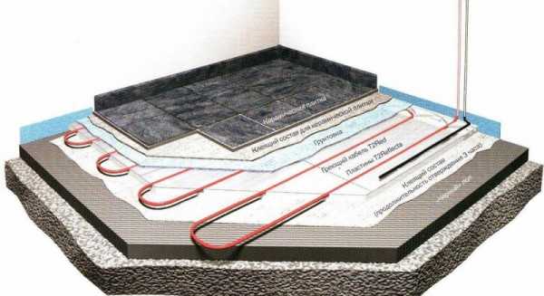 Поверх теплого пола наносится клеящий состав, на который ложится плитка