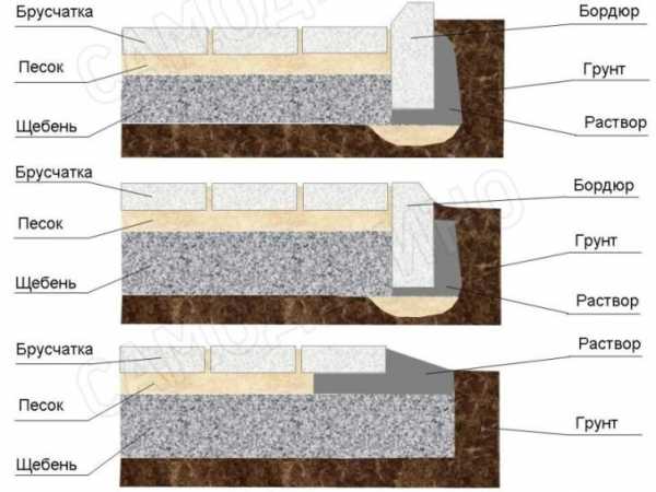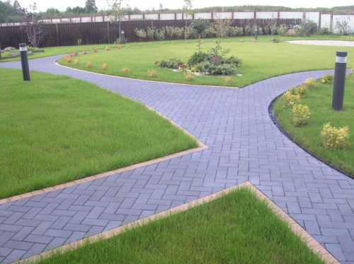 При отсутствии бордюра дорожка из брусчатки развалится. Бордюрный камень может быть установлен как выше полотна дорожки, так и вровень с ним. При размещении на покрытии лотков для отвода воды их удобно обустроить рядом с ограждением дорожки.