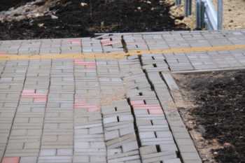 - Выполняется монтаж тротуарной плитки. Все элементы стоит внимательно осмотреть, чтобы убедиться в отсутствии повреждений на лицевой поверхности.