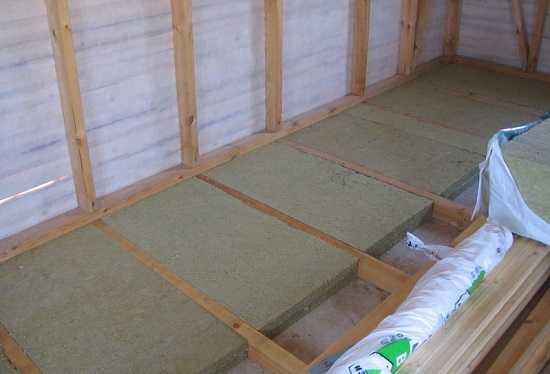 Дешевый и эффективный материал — минеральная вата. Выпускается в рулонах и плитах, легкий по весу, простой в укладке. Размер полотна выбирают таким образом, чтобы не сминать его и не загибать. Это ухудшает защитные качества из-за уменьшения количества воздуха между волокнами. Основной недостаток минеральной ваты — низкая влагостойкость, поэтому необходимо использовать следующим слоем пароизоляцию.