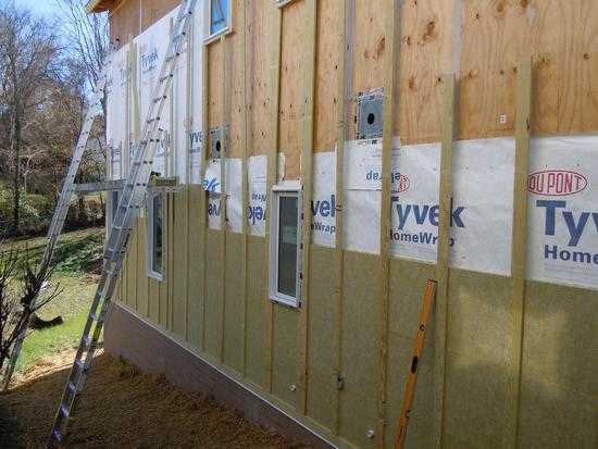 - Для обустройства вентилируемого фасада необходимо сделать вертикальную обрешетку. Для этого к стенам прибиваются деревянные доски, чтобы утеплитель лег максимально плотно, расстояние между ними делается на 5-8 мм меньше, чем ширина плит.