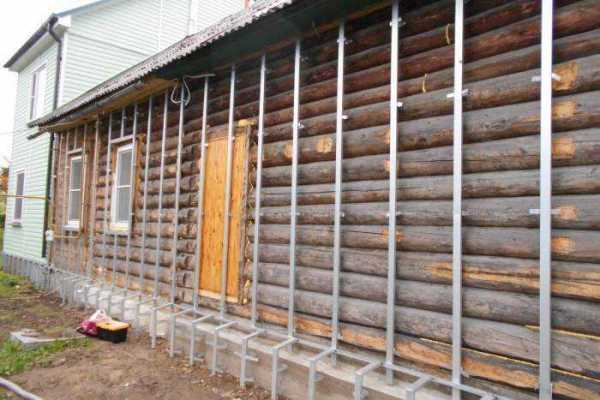 При наружном утеплении пенопластом бревенчатого сруба, который за счет естественной округлости бревен имеет неровные стены, делают двухслойную обрешетку. Для этого сначала устанавливают вертикальные стойки, а затем после укладки в них теплоизоляционных плит, их дополнительно крепят горизонтальными направляющими. Такое крепление обеспечивает более плотное прилегание утеплителя и делает конструкцию еще надежней.