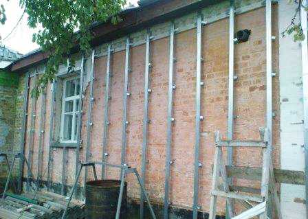 ΠΠΎ-ΠΏΠ΅ΡΠ²ΡΡ , ΠΏΠ΅ΡΠ΅Π΄ Π½Π°ΡΠ°Π»ΠΎΠΌ ΠΌΠΎΠ½ΡΠ°ΠΆΠ½ΡΡ ΡΠ°Π±ΠΎΡ, Π°Π±ΡΠΎΠ»ΡΡΠ½ΠΎ Π²ΡΡ ΠΏΠΎΠ²Π΅ΡΡ Π½ΠΎΡΡΡ ΡΡΠ΅Π½ Π·Π°ΠΊΡΡΠ²Π°Π΅ΡΡΡ ΠΏΠ°ΡΠΎΠΈΠ·ΠΎΠ»ΠΈΡΡΡΡΠ΅ΠΉ ΠΏΠ»Π΅Π½ΠΊΠΎΠΉ, ΠΊΠΎΡΠΎΡΠ°Ρ Π±ΡΠ΄Π΅Ρ Π·Π°ΡΠΈΡΠ°ΡΡ Π½Π°ΡΡΠΆΠ½ΡΡ ΡΡΠ΅Π½Ρ Π΄ΠΎΠΌΠ° ΠΎΡ ΠΏΡΠΎΠ½ΠΈΠΊΠ½ΠΎΠ²Π΅Π½ΠΈΡ Π²Π»Π°ΠΆΠ½ΡΡ ΠΏΠ°ΡΠΎΠ² Π²ΠΎΠ·Π΄ΡΡ Π° ΠΈΠ·Π½ΡΡΡΠΈ Π΄ΠΎΠΌΠ°. ΠΠ°ΡΠ΅ΠΌ ΠΏΡΠΎΠ²ΠΎΠ΄ΡΡ ΠΊΡΠ΅ΠΏΠ»Π΅Π½ΠΈΠ΅ Π½ΡΠΆΠ½ΠΎΠ³ΠΎ ΠΊΠΎΠ»ΠΈΡΠ΅ΡΡΠ²Π° Π-ΠΎΠ±ΡΠ°Π·Π½ΡΡ ΠΏΠΎΠ΄Π²Π΅ΡΠΎΠ², ΠΊΠΎΡΠΎΡΡΠ΅ Π±ΡΠ΄ΡΡ ΠΈΡΠΏΠΎΠ»ΡΠ·ΠΎΠ²Π°ΡΡΡΡ Π²ΠΎ Π²ΡΠ΅ΠΌΡ ΡΠ±ΠΎΡΠΊΠΈ ΠΊΠ°ΡΠΊΠ°ΡΠ° Π΄Π»Ρ Π³ΠΈΠΏΡΠΎΠΊΠ°ΡΡΠΎΠ½Π½ΠΎΠΉ ΠΊΠΎΠ½ΡΡΡΡΠΊΡΠΈΠΈ, Π° ΠΏΠΎΡΠΎΠΌ Π΄Π΅Π»Π°Π΅ΡΡΡ Π½Π° ΠΏΠΎΠ²Π΅ΡΡ Π½ΠΎΡΡΠΈ Π½Π°ΡΡΠΆΠ½ΠΎΠΉ ΡΡΠ΅Π½Ρ ΡΠ°Π·ΠΌΠ΅ΡΠΊΠ° ΠΏΠΎΠ΄ Π½Π°Π²Π΅ΡΡ. Π ΡΠ²ΡΠ·ΠΈ Ρ ΡΠ΅ΠΌ, ΡΡΠΎ ΠΊΡΠ΅ΠΏΠ»Π΅Π½ΠΈΠ΅ ΠΏΡΠΎΡΠΈΠ»Π΅ΠΉ Π±ΡΠ΄Π΅Ρ Π²Π΅ΡΡΠΈΠΊΠ°Π»ΡΠ½ΠΎ, Π½Π΅ΠΎΠ±Ρ ΠΎΠ΄ΠΈΠΌΠΎ Π·Π°ΠΊΡΠ΅ΠΏΠ»ΡΡΡ ΠΏΠΎΠ΄Π²Π΅ΡΡ, Π²ΡΠ΄Π΅ΡΠΆΠΈΠ²Π°Ρ Π½ΡΠΆΠ½ΠΎΠ΅ ΡΠ°ΡΡΡΠΎΡΠ½ΠΈΠ΅ ΠΌΠ΅ΠΆΠ΄Ρ Π½ΠΈΠΌΠΈ. ΠΠ»Ρ Π²ΠΈΠ½ΠΈΠ»ΠΎΠ²ΠΎΠ³ΠΎ ΡΠ°ΠΉΠ΄ΠΈΠ½Π³Π° ΠΎΠ½ΠΎ ΡΠΎΡΡΠ°Π²Π»ΡΠ΅Ρ 40 ΡΠΌ, Π° Π΄Π»Ρ ΠΌΠ΅ΡΠ°Π»Π»ΠΈΡΠ΅ΡΠΊΠΎΠ³ΠΎ β 60 ΡΠΌ.