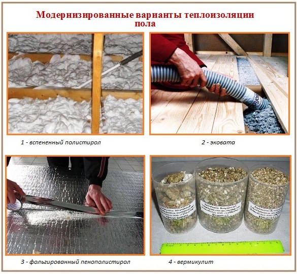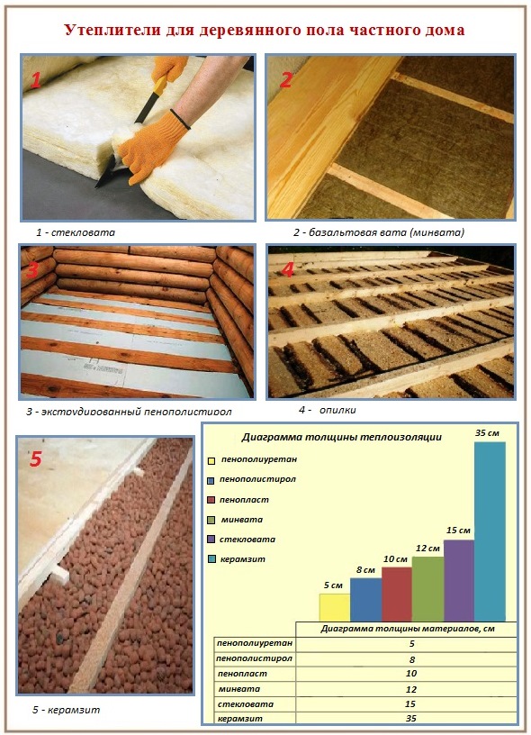Широко используется пенопласт и пенополистирол, свои особенности имеет применение стекловаты и минеральной ваты. Наиболее прост и дешев метод утепления поверхности деревянного пола керамзитом или с помощью древесных опилок. Неплохими рабочими характеристиками отличается так называемая сухая стяжка.