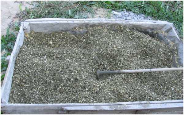 Для приготовления раствора на 5 квадратных метров площади понадобится 20 ведер опилок, 3 ведра воды и 0,3 ведра цемента. Цемент растворяем в воде, добавляем туда опилки и тщательно перемешиваем. В итоге все опилки должны окраситься в равномерный серый цвет.