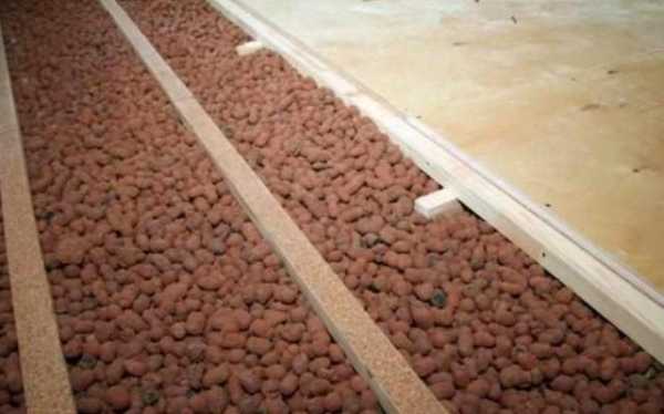 После того, как плиты будут надежно закреплены с помощью реек, сверху их нужно посыпать керамзитной крошкой. Такая слоистость обеспечит белее надежную степень защиты всей конструкции от воздействия зимнего холода.