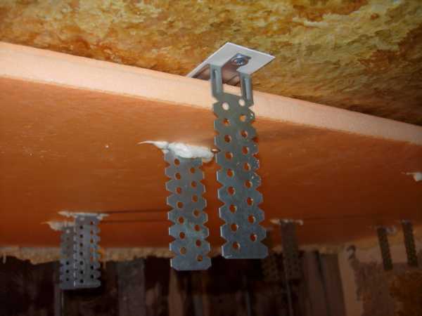 Работа с минеральной ватой и подобными материалами начинается с ее крепления с помощью каркаса подвесного потолка. В первую очередь нужно набрать каркас, затем выложить утеплитель. Фиксация утеплительного материала проводится П-образным загибанием кронштейна, который удерживает профили. После этого потолок следует обшивать гипсокартоном. Обшивку лучше проводить с помощью саморезов, изготовленных из каленой стали.