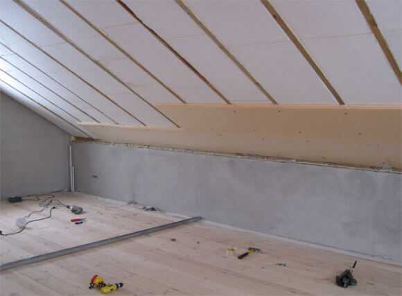 - На финишном этапе выполняется закрытие утеплителя гипсокартоном или другим отделочным материалом в зависимости от предпочтений домовладельца.
