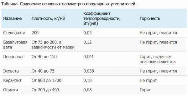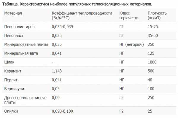 Таблица. Характеристики наиболее популярных теплоизоляционных материалов