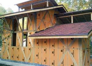 - В завершение к деревянному каркасу крепится финишный отделочный материал. Наиболее часто для этих целей используется металлический или пластиковый сайдинг или пластиковые панели с имитацией различных строительных материалов.