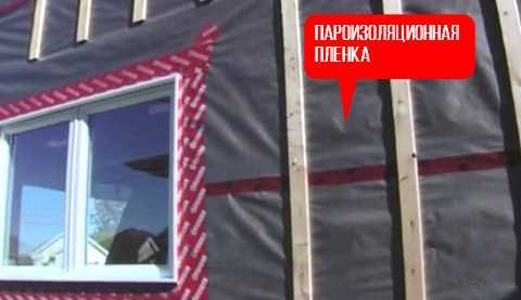 - В первую очередь всю площадь фасада нужно закрыть пароизоляционной мембраной, после чего от кровли до цоколя закрепить на нем вертикальные бруски, выдерживая расстояние между ними на 22-32 мм меньше, чем ширина утеплителя.